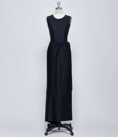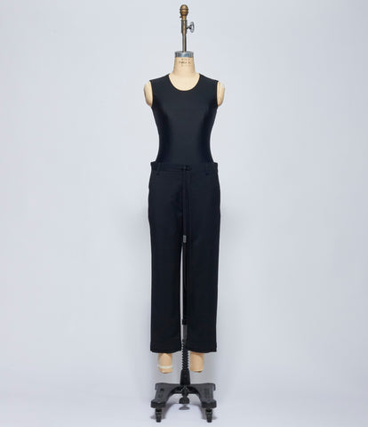 Wool vest in black featuring raw edge cotton, two layer peak-a-boo panels at hem. V-neck neckline into center front button closure. Additional single button at right chest side for twist across closure. Two double welt pockets waist front. Viscose cotton twill back panel. Adjustable buckled belt at back. 100% wool. 100% cotton. Lining: 52% viscose, 48% cotton. Dry clean only. IT sizing. Made in Italy. Mannequin is wearing size 40. Mannequin size 6.