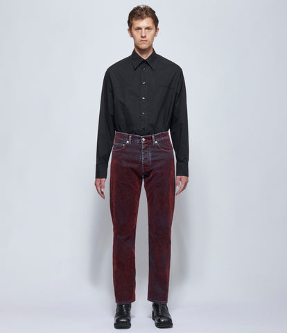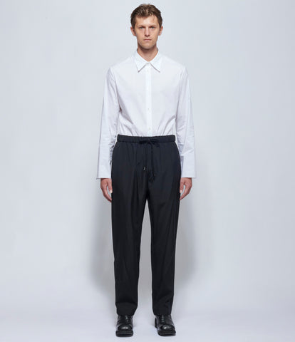 Polyester virgin wool blend tailored leg pants in black. Zip fly single hook and bar and button closure. Two slant pockets at front. Single double welt pocket with single button closure at right back side. Single pleats at front and back of each leg. Removable snap button closure adjustable buckled belt at waist. Belt loops at waist. 55% polyester, 45% virgin wool. Dry clean only. IT sizing. Made in Italy. Model is wearing size 48. Model is 6'2" and Chest 38 / Shoulder 19.5 / Waist 31 / Hip 37.5.