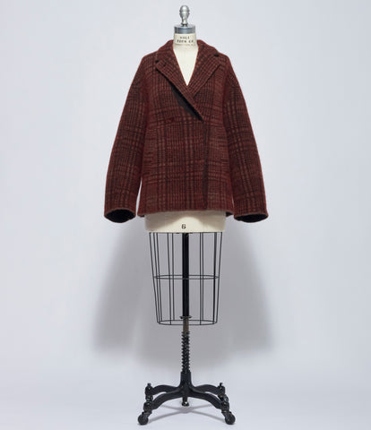 Nylon blend sparkling knit sleeveless dress in brown. V-neck neckline into hidden placket button closure till waist. Spread collar. Two inseam pockets at waistline. Bubble hem. 43% nylon, 24% mohair, 12% viscose, 11% wool, 7% paper yarn, 3% cotton. Dry clean only. IT sizing. Made in Italy. Mannequin is wearing size S. Mannequin size 6.