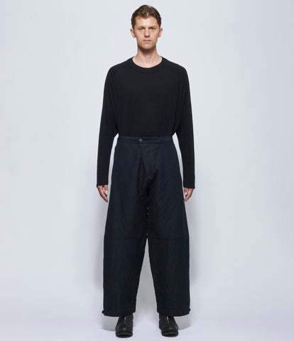 Linen wool cashmere blend striped loose fit trousers in brown featuring adjustable drawstrings at hems. Diagonal button fly with two button closure. Two slant pockets with smaller patch pockets behind at waist front. Two patch pockets at back. Elasticized waistband at back. Paneling at knees.51% linen, 42% wool, 7% cashmere. Hand wash cold. Hand Made in Belgium, Jan-Jan Van Essche studio. Model is wearing size S. Model is 6'2" and Chest 38 / Shoulder 19.5 / Waist 31 / Hip 37.5.