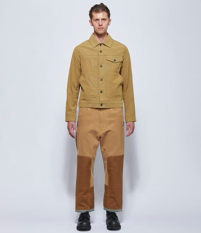 Cotton canvas straight leg pants featuring sand, blue denim, and brown paneling throughout. Zip fly single button closure. Two curved pockets waist front. Two Levi's patch pockets at back. Adjustable buckled strap at back. Cowhide leather Levi's jacron at back. 100% cotton. Patch: 100% cowhide. Hand wash. JP sizing. Made in Japan. Model is wearing size M. Model is 6'2" and Chest 38" / Waist 32" / Hip 35".