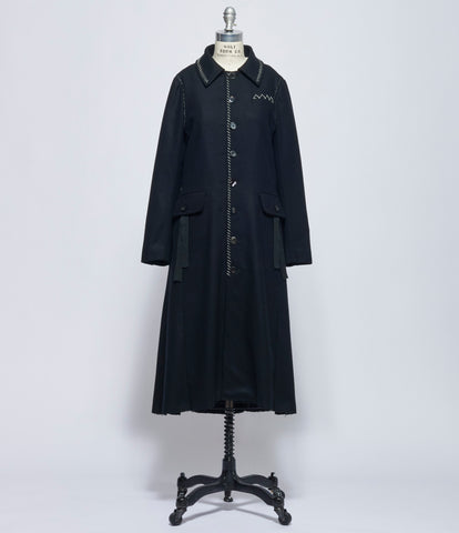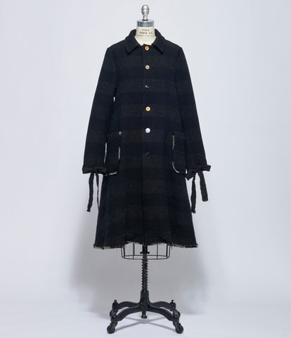 Long wool two layer trench coat in black featuring woven wool blend drape across back towards front left side. Top layer features a woven wool panel at front left side with a spread collar and a wool panel at right side with a notched lapel collar. Bottom layer features rounded neckline. Two welt pockets waist front at both top and bottom layers. Adjustable buckled belt at waistline. Belt loops at waistline. Adjustable buckled straps at cuffs. Pleated drape at back. 100% wool. Parts: 85% wool, 15% nylon. 80% wool, 10% polyester, 5% acrylic, 5% nylon. Sleeves lining: 100% cupro. Dry clean only. JP sizing. Made in Japan. Mannequin is wearing size 3. Mannequin size 6.