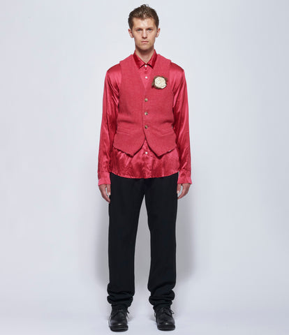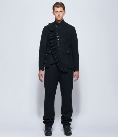 Linen blazer in ivory featuring raw edge finishes throughout. Peak lapel stand collar. Nine button closure at front. Single welt pocket at left chest side with removable silk floral brooch. Two welt pockets with flaps waist front. Single button closure surgeon's cuffs. Two vents at back. 100% linen. Lining: 100% cotton. Dry clean only. UK sizing. Made in England. Mannequin is size 6 wearing size S.