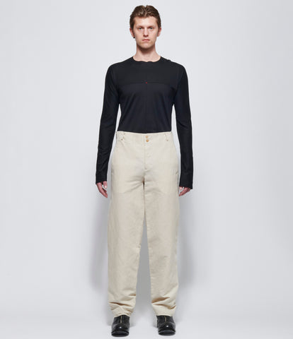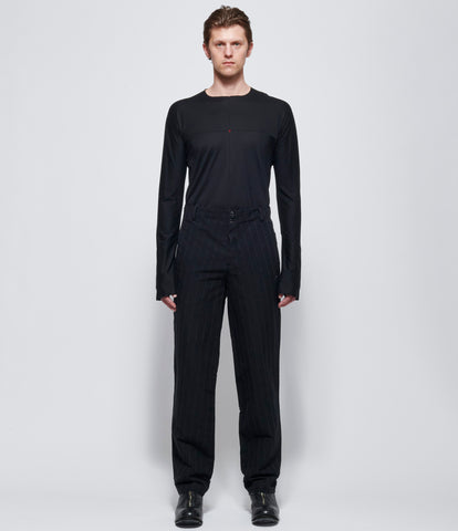 Cotton blend twill wide pants in black. Zip fly two button closure at front. Two slit pockets at sides with extending seam line down each front leg. Belt loops at waist. 71% cotton, 27% cupro, 2% elastane. Dry clean. Made in Italy. Model is wearing size 48. Model is 5'10" and Chest 32 / Waist 25 / Hip 36.